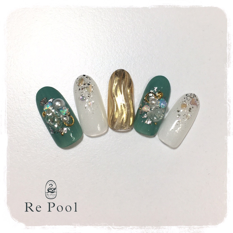 グリーン、ホワイト、ゴールドで爽やかな色合いに。シェルやパール、ゴールドパーツで華やかに。